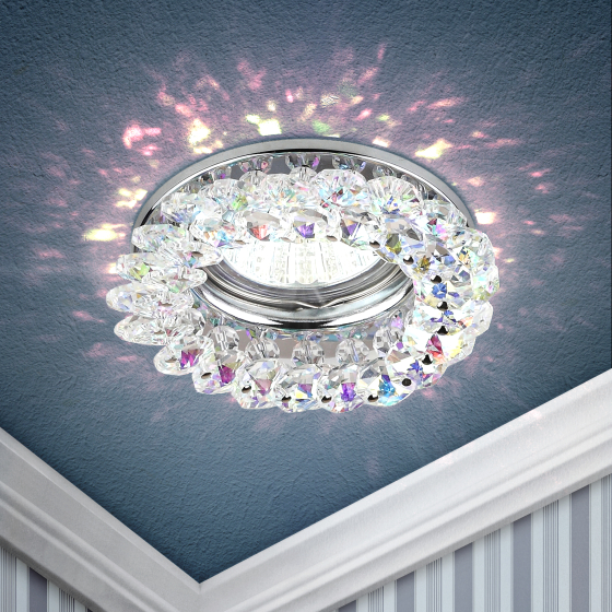 Встраиваемый светильник DK16 CH/PR круглый с мелкими хрусталиками станет эффектным решением для любого помещения: его можно разместить в спальне, в детской или на кухне. Светильник можно использовать как в качестве базового освещения, так и для создания акцентов в определенных зонах комнаты. Благодаря скрытой части корпуса светильники можно встраивать в потолок или стены, создавая разный дизайн помещений. Встраиваемый светильник ЭРА с приятным дизайном подойдет для помещений с разным интерьером: от минимализма до хай-тека, прованса или скандинавского стиля. При помощи точечных светильников можно освещать только те участки помещения, которыми вы пользуетесь в данный момент, не затрачивая лишнюю элеткроэнергию. Максимальная мощность лампы – 50 Вт. Корпус встраиваемого светильника изготовлен из нержавеющей стали. Диаметр отверстия, требуемого для установки светильника составляет 65 мм, а диаметр самого светильника – 90 мм. Цоколь под лампу GU5.3 в комплекте. Купив встраиваемый светильник бренда ЭРА, вы останетесь довольны и сможете создать уют в доме! Внимание: лампа не входит в комплектацию.