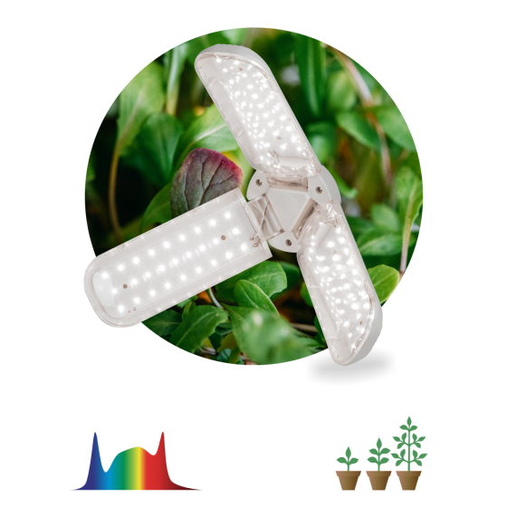 Эта удобная бытовая фитолампа-трансформер полного спектра по своей мощности и эффективности не уступает профессиональному фитопрожектору. Обеспечивает качественную досветку 2 кв м рассады. Мягкий белый свет комфортен для глаз человека. Поворотные лепестки позволяют быстро и без усилий изменить направление и интенсивность освещения конкретных растений. Эффектный внешний вид и максимальный комфорт в применении. На каждом лепестке по 27 светодиодов. Каждый лепесток поворачивается на 180 градусов. Индивидуальное регулирование наклона и направления светодиодных "лепестков" дает возможность создать множество уникальных сценариев подсветки растений.