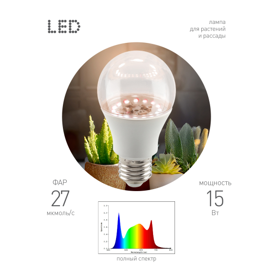Наименование/модель: Лампа для выращивания растений ФИТО А60-15W-PFR-E27-GR, полного спектр