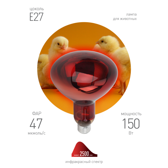 Преимущества: Инфракрасная зеркальная лампа с красной колбой. Активно используется в животноводстве, птицеводстве и растениеводстве. Максимальная тепловая мощность без яркого света. Идеальна для стабилизации теплового баланса новорождённых и молодых животных. 100 % энергии переходит в тепловую. Работа лампы не зависит от скачков сети, микроимпульсов. Не требуются стабилизаторы напряжения – лампа работает даже при пониженном напряжении. Мгновенно включается и нагревается. Минимум пульсаций освещения. Компактные размеры (удобно при транспортировки и использовании). Используется только с керамическими цоколями (не с пластиковыми!).
